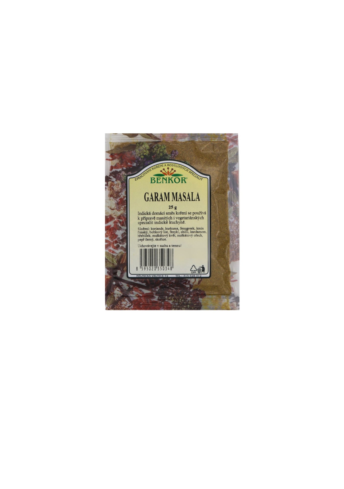 Složení: koriandr, kurkuma, fenugreek, kmín římský, bobkový list, fenykl, chilli, kardamom, hřebíček, muškátový květ, muškátový ořech, pepř černý, skořice.